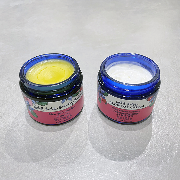 画像の右が「ワイルドローズ グロウ フェイシャルクリーム」(保湿クリーム)、左は「ワイルドローズ ビューティバーム」(美容バーム)です。