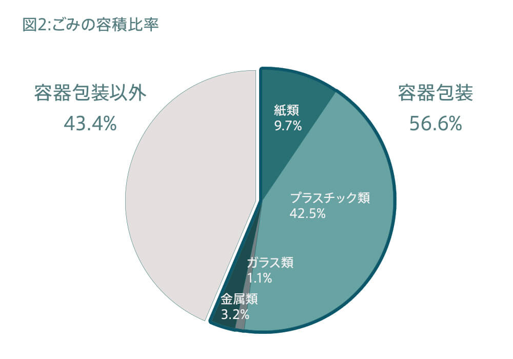 これは1年にして335.8kgにもなります。そのうち容積比率にして50%以上が容器包装のごみです(図2)
